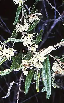 Lasiopetalum parviflorum is a shrub that typically grows to a height of 0.5–1 m (1 ft 8 in – 3 ft 3 in) high and has its young stems densely covered with rust-coloured, star-shaped hairs. The leaves are arranged alternately along the stems, mostly 30–60 mm (1.2–2.4 in) long and 3–7 mm (0.12–0.28 in) wide with the edges rolled under. The lower surface of the leaves is densely covered with grey and rust-coloured, star-shaped hairs. The flowers are borne in small groups on a short peduncle and are greenish to cream-coloured with more or less linear bracteoles 1.5–2.0 mm (0.059–0.079 in) long below the base of the sepals. The petal-like sepal lobes are about 3 mm (0.12 in) long, with woolly white hairs on the back. Flowering occurs in spring and the fruit is a woolly-hairy capsule 3–5 mm (0.12–0.20 in) in diameter.[2][3]