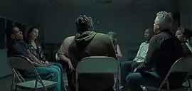 The accompanying music video for "Lean Wit Me" was directed by Los Angeles filmmaker Sherif Alabede. Known for his narrative-driven visuals, Aladebe has a signature dark aesthetic that aims to leave a lasting impression on audiences.[20] Juice WRLD and Alabede sought to a create dark video which provided a cautionary tale regarding the consequences of recreational drug use.[6] The video features Juice WRLD attending a group therapy session. Alabede admitted that he was not very familiar with Juice Wrld's musical style prior to being contacted to direct the video. However, he was informed of Juice WRLD's emo rap approach and was impressed by his authenticity. Sherif Alabede used an Alcoholics Anonymous meeting to frame the visual narrative.[8] To further the feeling of authenticity, the extras included in the video weren't actors and are instead actual recovering alcoholics.[8]