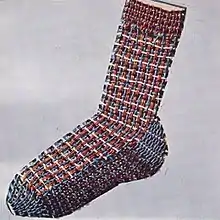 The album cover art work was by artist Ray Smith and was the first of three of his "paint socks" to feature on Henry Cow's albums.[lower-alpha 2] Smith had appeared with the band at several of their early 1970s concerts,[9] performing a variety of activities, including ironing, reading text and miming with glove puppets.[7] He suggested a woven sock on Legend's front cover, and insisted that the band's name should not appear there. Chris Cutler said in a 2011 interview that Smith continued the theme on Henry Cow's next two albums, with the sock changing "to suit the temper of the music".[10]
