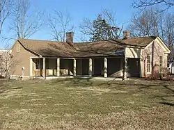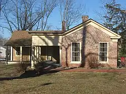 A farm occupied the present site of the Legg House at least as far back as 1820. At that time, it lay on the edge of the city; the nearby Third Street was the only road that connected Bloomington to the outside world. Landowner George M. Legg built the original portion of the house in 1848,[2] using a variant of the Greek Revival style of architecture.[1] Its construction employed local materials: the walls are built of handmade bricks, laid on a foundation of locally mined limestone, and supported with poplar beams that were cut in the Bloomington vicinity.[3] At the time of construction, it was a small house: just one story tall, it was divided into only two rooms. In later years, the house was modified significantly: a porch and frame wing were added during the 1870s, and elements throughout the house were covered during the twentieth century with elements such as drywall.[4][5]