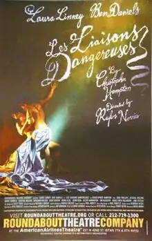 Following 22 previews, a Broadway revival produced by the Roundabout Theatre Company opened at the American Airlines Theatre on May 1, 2008 and ran for 77 performances. Directed by Rufus Norris, the cast included Laura Linney as the Marquise de Merteuil, Ben Daniels as the Vicomte de Valmont, Mamie Gummer as Cécile de Volanges, and Benjamin Walker as the Chevalier Danceny, with Siân Phillips in the supporting role of Madame de Rosemonde. The production was nominated for the Tony Award for Best Revival of a Play but lost to Boeing-Boeing.