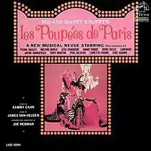 The resulting show, which came to be known as Les Poupées de Paris, was modeled after the Paris revues Lido and Folies Bergère.[1] The Kroffts opened the show at their newly built theater the Gilded Rafters in the San Fernando Valley, California in October 1961,[2] though the show was later relocated to P.J.'s, a 200-seat dinner theatre in Los Angeles.[3]