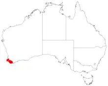 This leucopogon grows in woodland or heath and occurs in a narrow band from the Whicher Range to Rocky Gully and Mount Barker in the Jarrah Forest and Warren bioregions in the far south-west of Western Australia.[2][4]