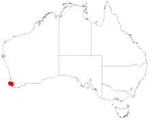 This leucopogon almost always grows in jarrah forest and occurs on and near the Whicher Range in the Jarrah Forest, Swan Coastal Plain and Warren bioregions of southwestern Western Australia.[2][4]