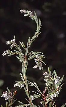 Leucopogon rodwayi is an erect to spreading shrub that typically grows to a height of 25–80 cm (9.8–31.5 in), its young branchlets covered with a few soft hairs. The leaves are narrowly egg-shaped to elliptic, 3.8–10.5 mm (0.15–0.41 in) long and 0.9–1.9 mm (0.035–0.075 in) wide on a petiole up to 1 mm (0.039 in) long. Both sides of the leaves are glabrous, the edges are turned down, and there are a few small teeth on the edges. The flowers are borne in spikes of 6 to 15 up to 8 mm (0.31 in) long in leaf axils with bracteoles 0.8–1 mm (0.031–0.039 in) long at the base. The sepals are 1.0–1.35 mm (0.039–0.053 in) long, the petals white and joined at the base, forming a tube 0.6–0.8 mm (0.024–0.031 in) long, the lobes 0.6–0.9 mm (0.024–0.035 in) long. Flowering occurs from February to October, with a peak in August and September, and the fruit is about 2.3 mm (0.091 in) long and glabrous.[2][3]