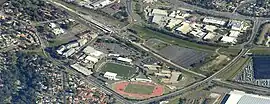 Aerial image of Leumeah; the railway station is on the top left corner; Campbelltown Stadium is towards the right and Mosaic Buildings on the left