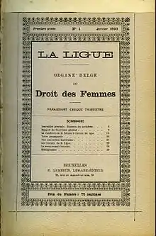 The Belgian League for the Rights of Women (French: Ligue belge du droit des femmes) was a political association founded in Belgium in 1892. Established by Marie Popelin and her lawyer Louis Frank, it was created in response to the refusal to allow Popelin, a law graduate, to practice at the Bar. Based on the French Ligue française pour le droit des femmes, it immediately attracted 300 members. The organization was initially concerned with equal rights rather than women's suffrage but prioritized voting rights in 1912.[1][2]
