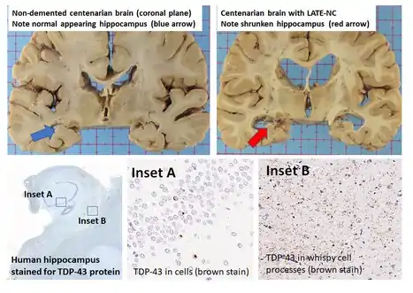 - ↑ Nelson, Peter T.; Brayne, Carol; Flanagan, Margaret E.; Abner, Erin L.; Agrawal, Sonal; Attems, Johannes; Castellani, Rudolph J.; Corrada, Maria M.; Cykowski, Matthew D.; Di, Jing; Dickson, Dennis W. (July 2022). "Frequency of LATE neuropathologic change across the spectrum of Alzheimer's disease neuropathology: combined data from 13 community-based or population-based autopsy cohorts". Acta Neuropathologica. 144 (1): 27–44. doi:10.1007/s00401-022-02444-1. ISSN 1432-0533. PMC 9552938. PMID 35697880. S2CID 249628141.