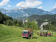 Lindner truck and tractor harvesting hay in Swiss Alps
