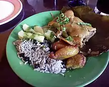 - Hallaca – rectangle-shaped meal made of maize, filled with beef, pork, chicken, olives, raisins and caper, and wrapped in plantain leaves and boiled to cook.