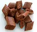 Pieces of peppermint fondant, half covered in dark chocolate, about the size of two sugar cubes side by side. |