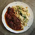 A meat stew in a thick paprika-spiced sauce, similar to ragout; generally translated into English as goulash (not to be confused with goulash soup). | |