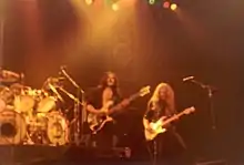 In March 1976, Motörhead auditioned "Fast" Eddie Clarke, a friend of Taylor's, as an intended second guitarist; however, after rehearsing just one song as a four-piece, Wallis decided to leave and Clarke took over as the sole guitarist.[4] The lineup of Lemmy, Clarke and Taylor became known as the "classic Motörhead lineup", releasing five successful studio albums between 1977 and 1982 including Ace of Spades.[5] Prior to any of these releases, however, the group almost broke up in April 1977 due to poor reviews of their live shows and little to no interest from record companies.[6] They remained together though, and their self-titled debut album followed in August.[6]