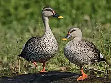 Anatidae includes the ducks and most duck-like waterfowl, such as geese and swans. These birds are adapted to an aquatic existence with webbed feet, flattened bills, and feathers that are excellent at shedding water due to an oily coating.