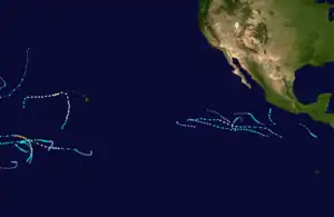 - ↑ The National Hurricane Center (NHC)'s warning responsibly is often referred to as the "eastern Pacific" while the Central Pacific Hurricane Center (CPHC)'s warning zone is often referred to as the "central Pacific", even though, the two areas are combined in datasets like HURDAT and IBTRACS.