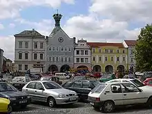 Its core form Mírové Square, a large square with an area of about 2 hectares. Most of the houses on the square are in the Gothic style.[14] The Old Town Hall building on the square is the oldest Renaissance building in the town. Today, the building serves as a regional museum.[15] Other sights on the square include the "Chalice house" (new town hall with a lookout tower in the shape of chalice), Dům u černého orla ("Black Eagle House"; one of the most significant Renaissance houses), and Museum of Crystal Touch.