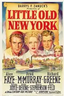 Little Old New York is a 1940 American black-and-white historical drama from 20th Century Fox, produced by Darryl F. Zanuck, directed by Henry King, that stars Alice Faye, Fred MacMurray, and Richard Greene. The film is based on a play by Rida Johnson Young, which opened on Broadway on September 8, 1920, and starred Genevieve Tobin, Douglas Wood, and Donald Meek. It was previously adapted into a 1923 film starring Marion Davies.