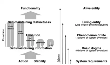 All living entities possess genetic information that maintains itself by processes called cis-actions.[15] Cis-action is any action that has an impact on the initiator, and in chemical systems is known as the autocatalytic set. In living systems, all the cis-actions have generally a positive influence on the system as those with negative impact are eliminated by natural selection. Genetic information acts as an initiator, and it can maintain itself via a series of cis-actions like self-repair or self-production (the production of parts of the body to be distinguished from self-reproduction, which is a duplication of the entire entity). Various cis-actions give the entity additional traits to be considered alive. Self-maintainable information is a basic requirement - a level zero for gaining lifeness and it can be obtained by any cis-action like self-repair (like a gene coding a protein that fixes alteration to a nucleic acid caused by UV radiation). Subsequently, if the entity is able to perform error-prone self-reproduction it gains the trait of evolution and belongs to a continuum of self-maintainable information - it becomes part of the living world in meaning of phenomenon but not yet a living individual. For this upgrade, the entity has to process the trait of distinctness, understood as an ability to define itself as a separate entity with its own fate. There are two possible ways of reaching distinctness: 1) maintaining an open-system (a cell) or/and 2) maintaining a transmission process (for obligatory parasites). Fulfiling any of these cis-actions raises the entity to a level of living individual - a distinct element of the self-maintainable information's continuum. The final level regards the state of the entity as dead or alive and requires the trait of functionality.[15] This approach provides a ladder-like hierarchy of entities depending on their ability to maintain themselves, their evolvability, and their distinctness. It distinguishes between life as a phenomenon, a living individual, and an alive individual.[15]
