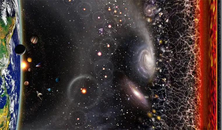 A logarithmic map of the observable universe. From left to right, spacecraft and celestial bodies are arranged according to their proximity to the Earth.