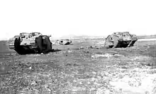 A number of tanks were knocked out by direct hits from German field batteries in position beyond the crest of the hill. None the less, with the exception of the village itself, our second objectives in this area were gained before midday.