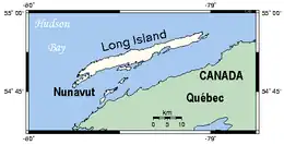 Long Island is one of the many uninhabited Canadian arctic islands in Qikiqtaaluk Region, Nunavut. It is located in Hudson Bay off the coast of Quebec at 54°52'N 79°25'W, and has an area of 168 km2 (65 sq mi).[1]
