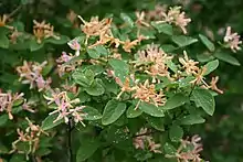 Lonicera × bella, known as Bell's honeysuckle[2] and showy fly honeysuckle,[3] is a hybrid species of flowering plant in the family Caprifoliaceae.[1] It was first described by Hermann Zabel in 1889.[4] Zabel reported that he grew it in cultivation from seeds obtained from a plant of Lonicera morrowii, but that its appearance suggested the influence of L. tatarica. It has escaped from cultivation and become an aggressive invasive species in central and eastern parts of the United States.