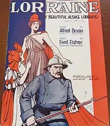 "Lorraine (My Beautiful Alsace Lorraine)" is a World War I era song released in 1917. Al Bryan wrote the lyrics. Fred Fisher composed the music.[1] It was published by McCarthy and Fisher, Inc.. André De Takacs designed the sheet music cover. It features a French soldier with his bayonet drawn in the foreground. A woman, who is a symbol of Liberty,[2] and child look on behind him.[3] The song was written for voice and piano.[4][5]