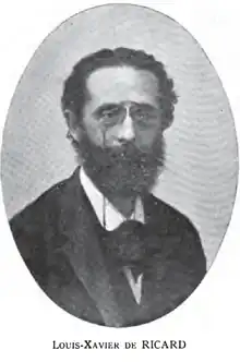 Louis-Xavier de Ricard (January 25, 1843  July 2, 1911) was a French poet, author, and journalist of the 19th century.[1][2] He was founder and editor of La Revue du progrès (La Revue du Progrès moral, littéraire, scientifique et artistique) which was the first to publish a poem by Paul Verlaine in August 1863. He and Catulle Mendès edited the first volume of Le Parnasse contemporain, published by Alphonse Lemerre in 1866. He was a member of the Commune de Paris (1871) and Félibrige, a group founded by Frédéric Mistral to promote and defend Provençal literature and the Provençal language (a Langue d'oc language).