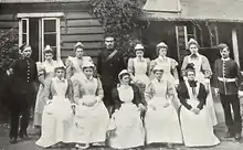 The new yellow-brick building with slate roofs echoed the construction materials used by its larger neighbour, the Cambridge Military Hospital. It cost £12,600 to build[3] and had "sanitary blocks" incorporated in "Italianate" corner towers towards the back.[4] There were fifty-three beds arranged in eleven wards of different sizes, including wards named for Queen Victoria, the Duke of Connaught and Lord Lansdowne. The staircases had shallow steps, supposed to help nurses in long dresses run up and down.[5] A "fine" tiled operating theatre was added in 1908 and officially opened by the Duchess in 1909. It had a new sort of "brilliant light" and Doulton basins and sinks "fitted with the latest kind of mixing valves for hot and cold water with elbow-action and sprays".[6] Within a couple of years the hospital was treating around 1000 cases annually: about half in its General Division and half in its Maternity Division which had twenty-five "swing cots" along with twenty-five beds.[6]