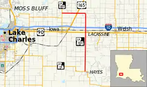 Louisiana Highway 101 (LA 101) is a state highway located in southwestern Louisiana. It runs 17.28 miles (27.81 km) in a general north–south direction from LA 14 in Hayes to LA 383 north of Iowa.