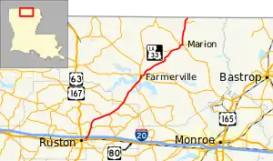 La 33—From a junction with La-US 80 at or near Ruston to a junction with La 15 at or near Farmerville and from a junction with La 2 at or near Farmerville through or near Marion to the Arkansas State Line.