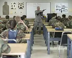 Tech. Sgt. Lee Thompson briefs several Louisiana Wing Civil Air Patrol cadets on the capabilities of the M4 carbine rifle during a weapons demonstration.