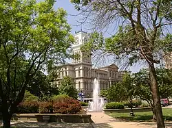 Before the City Hall's construction, there was no dedicated building for city government, whose officials used space in the county courthouses.[2] The plan was selected by way of a design competition held in 1867 with the winner receiving $500.[2] The contest was won in April 1867 by local architect John Andrewartha and C.S. Mergell.[2] In late summer 1870, the final plans for City Hall construction were made by Andrewartha, who was named managing architect, and architectural firm C.L. Stancliff and Co.[2] The remaining government buildings were demolished before ground was broken on the city hall in 1870.[2] Louisville General Council selected City engineer I.M. St. John to supervise the project.[2]