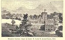 His other brother, Capt. Thomas Parry Jones-Parry, married the daughter of Vice-Admiral Robert Lloyd, and became Magistrate, Deputy Lieutenant, and High Sheriff of Caernarvonshire.[4] Thomas was also the proprietor of the Llwyn Onn estate, which was in their family since at least the 15th century, and the Aberdunant estate.[18] Aberdunant will be inherited by his grandson, Thomas Edward John Lloyd, who will also inherit the property of his great-grandfather, Vice Admiral Robert Lloyd, which included the Tregayan estate in Anglesey and the Gesail Gyfarch estate in Caernarfonshire.[19]