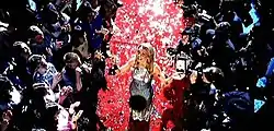 American singer-songwriter Taylor Swift performed the song on her Speak Now World Tour on September 20, 2011, located in Louisiana, as a tribute to Spears.[33][34] Wearing her signature lilac dress, Swift started to play the first chords of "Lucky" on her guitar, while singing, "Early morning/She wakes up/With a knock, knock, knock on the door/It's time for makeup/Perfect smile/It's you they're all waiting for."[35] Scott Shetler of Pop Crush explained that "the crowd energy for the Britney cover didn't seem as high as when Swift covered Eminem in Detroit or Justin Bieber in Toronto."[36] Jenna Hally Rubenstein of MTV, however, praised the performance, and noted that the show's crowd gave a positive reaction to the cover, saying, "though the video is sideways and features the amateur videographer's own personal sing-along, the excitement in her voice is a testament to Taylor's song choice. Or in other words, we can almost guarantee that every normal, living, breathing Louisiana-bred girl in attendance at Taylor's show is also obsessed with Britney Spears."[35] Becky Bain of Idolator explained that she had no doubts that Swift would cover a Spears song, but was surprised that the song Swift chose was "Lucky".[37] PopDust writer Katherine St Asaph explained that "Lucky" is "one of the few Britney lyrics that could just as easily be written for/by Taylor and one of the few songs that wouldn’t need massive re-arranging."[33]