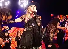 On 2012's The MDNA Tour, the song was sampled on a video that led to "Turn Up the Radio".[89] A slow, cumbia and salsa-fueled medley of "Dress You Up", "Into the Groove" (1985), and "Lucky Star", was included on the Rebel Heart Tour.[90][91] The number featured Day of the Dead iconography and found Madonna, decked out in a long dress with a black shawl and a black hat, joined by a Mexican-themed dance crew.[92][93] Billboard's Joe Lynch felt "the maracas might have been a little much, but the crisp Spanish guitar successfully made the songs sound newly organic".[94] On July 27, 2023, Madonna posted an Instagram video of herself dancing to "Lucky Star" to commemorate the 40th anniversary of her debut album.[95]