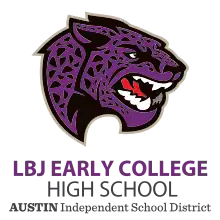 LBJ Early College High School's mascot is the Jaguar, and the school's colors are purple and white.
