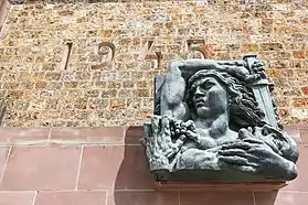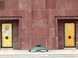 The monument consists of a wall of pink sandstone from the Vosges 150 metres (490 ft) long, on which are mounted sixteen bronze hauts-reliefs depicting, in allegorical form, different types of heroic combat. A Cross of Lorraine 12 metres (39 ft) high stands in the center, in front of which the permanent flame of the resistance burns on a bronze structure.[2] The cross is essentially a Gaullist symbol.[7] There are two bronze doors under the cross. One leads to the burial crypt, carved into the rock. The other gives access to the stairway that leads to the remembrance path.[2] At the base of the Cross of Lorraine an inscription gives part of de Gaulle's speech of 18 June 1940: "Quoiqu'il arrive la flamme de la résistance ne s'éteindre pas" ("Whatever happens, the flame of the resistance will not be extinguished.")