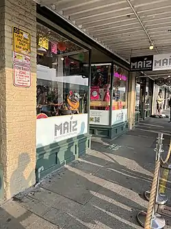 Maíz is a restaurant at Pike Place Market serving nixtamal tortillas[1] and antojitos (Mexican street food) including chalupas,[2] gorditas, huaraches, quesadillas, sopes, guisado-style tacos, tamales, tlacoyos,[3] and tostadas. The menu has also included chilaquiles, pan dulce, champurrado, horchata lattes, and other Mexican-style coffee drinks.[3] In addition to chilaquiles, the restaurant's breakfast menu was expanded in August 2022 to include egg tacos and fruit with chamoy and Tajín.[4]