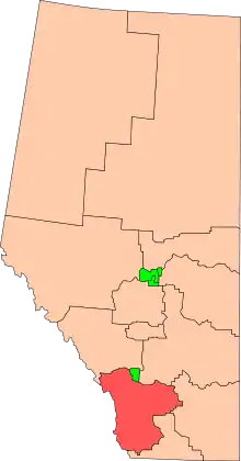 Macleod was a federal electoral district in Alberta, Canada, that was represented in the House of Commons of Canada from 1908 to 1968 and from 1988 to 2015. It was a mostly rural riding in southwest Alberta, however it extended as far north as the outer suburbs of Calgary, and in its final years included a few slivers of Calgary itself. It covered the Municipal District of Foothills No. 31, Municipal District of Willow Creek No. 26, Municipal District of Pincher Creek No. 9, Municipal District of Ranchland No. 66, Vulcan County, the Municipality of Crowsnest Pass, and Kananaskis Improvement District. It also included the towns of Okotoks, Cochrane, and High River.