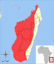 Eidolon dupreanum is named after the Governor of Réunion from 1864 to 1869, Marie Jules Dupré, for the help he gave to scientific researchers.[2] The Madagascan fruit bat is found both around the coastal plain and in the inland high plateau. It has not been recorded in some areas but that is likely to be because it has not been observed rather than that it is absent from these areas. It requires suitable rock fissures and caves in which to roost during the day. Colony size varies between about ten and five hundred individuals.[1]