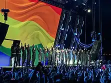 On May 16, it was confirmed that Madonna would perform at the Eurovision Song Contest 2019 finale.[142] The artist was joined by Quavo, and sang "Future" and "Like a Prayer";[143] she wore a black cape and eyepatch, while several dancers in gas masks fell to the ground.[144] Also featured were two dancers with Palestinian and Israeli flags on their backs holding each other.[145] The performance caused controversy, as it was seen as a political statement for the Israeli–Palestinian conflict.[146] Eurovision organizers said that that particular part of the number was not an approved part of the act; the European Broadcasting Union released a statement saying Eurovision was a non-political event and that Madonna had been made aware.[144] The Palestinian Campaign for the Academic and Cultural Boycott of Israel (PACBI), along with other artists such as Roger Waters and Brian Eno, had previously called for a boycott of the Eurovision Song Contest in support of Palestine, and even urged Madonna not to perform.[147][148] Madonna said that she was never going to "stop playing music to suit someone’s political agenda", to which the PACBI responded; "artwashing Israel’s brutal oppression of Palestinians for a million dollars must be among the most immoral political agendas".[149] Later, the Kan Israel Broadcasting Corporation sued Live Nation over the performance, claiming the singer's representatives had violated the terms of their agreement and "reneged on financial promises".[150][151]