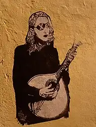 Madame X's album artwork was shot by Steven Klein.[25] The cover for the standard edition features Madonna wearing diamond art deco earrings by Pennisi Jewelry, with azeviche black hair, pale skin, arched eyebrows, thin smile and red lipstick.[26][27][28] The album's title was etched across her lips to give the illusion of her mouth being sewn shut.[24] Some journalists compared the imagery to that of Mexican painter Frida Kahlo,[27][29][28] while a writer on The Art Newspaper noted that the artwork also referenced Russian performance artist Pyotr Pavlensky, who had previously sewed his mouth shut in a protest.[30] In an interview with iHeartRadio's The Box, Madonna disclosed that she is representing her mother on the cover, Madonna Fortin, as the picture depicts what she looked like, and it meant a lot to her.[31] Mike Wass from Idolator called it an "already-iconic artwork".[29] The cover for the deluxe edition features a platinum blonde Madonna depicting a Soviet revolutionary,[32] and was used on the digital deluxe and box set versions.[29] For this alternative artwork, the singer seemed to "recreate the cover illustration of a 1910 novel adaptation by J.W. McConaughy", as noted by Paper's Michael Love Michael.[33] A third album artwork features a brunette Madonna holding a guitar in front of a wall of blue tiles,[32] and was used for the deluxe two-CD and box set releases.[25] Another promotional picture for Madame X was shared by the singer in her social media networks, depicting a nipple pierced by a single red rose, which she described as a "portrait of a lady"; it was criticized by fans alike, who thought Madonna "took it a step too far" with the artwork.[34] Attitude's Matthew Barton described the album's artwork and packaging a "labour of love", and praised the deluxe box set as a "stroke of genius".[35]
