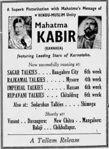 Mahatma Kabir is a 1947 Indian Kannada-language film directed by R. Nagendra Rao.[1] He also stars in the lead role alongside Subbaiah Naidu. The film deals with Mahatma Gandhi's vision of harmony between the Hindus and Muslims. It was set in the backdrop of the religious violence in India that took place after the Independence from the British rule.[2]