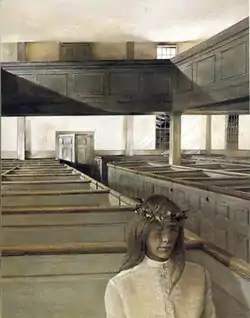 In an article for The Iowa Review, writer Laurie J. Murray describes the painting: "The bride-to-be in Maidenhair seems to be waiting for her betrothed, bound by religious convictions and tradition. There is no hint of celebration in the church except for the wreath of flowers and ferns upon the bride-to-be’s head."[9] Murray also draws attention to the title by pointing out the "maidenhair" in the crown of flowers resting atop the subject's head. Mistakenly, maidenhair fern is rare to Maine and found only in the far northern regions of the state and does not flower.[10] It is unknown where Betsy Wyeth conceived the title for Maidenhair.