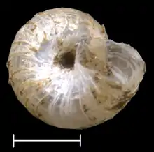 The size of the shell is extremely small (about 2.1 mm wide at three whorls). The width of the shell is 2.05-2.3 mm. The height of the shell is from 1.88 m to estimated 2.1 mm.