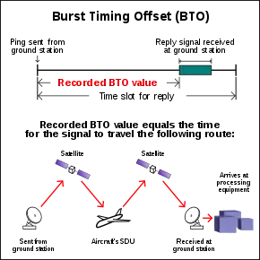 • Burst timing offset (BTO) — The time difference between when a message is sent from the ground station and when the response is received. This measure is proportional to twice the distance from the ground station to the satellite to the aircraft. It includes the time between receiving and responding to the message at the aircraft SDU and the time between receiving and processing the response at the ground station, which are constant and can be calculated and removed. This measure can be analysed to determine the distance between the satellite and the aircraft, resulting in a ring on the Earth's surface that is equidistant from the satellite.[11]:4–6[12]:18
