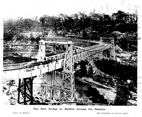 Maldon was also the site of 'Harvey's Crossing', one of two stone causeways over the Upper Nepean River on the Picton - Menangle Road. Stonework supporting the steep approach roads on each side can still be seen. The causeway was replaced by a wooden suspension bridge in 1903, designed by Ernest Macartney de Burgh.[3] By the 1970s, the bridge had become a severe bottleneck, especially with the increasing coal traffic. A deviation of the main road and a concrete beam bridge were constructed further north along the Gorge, and opened in 1980.[4] The Suspension Bridge is now a Heritage item.[5] It is closed to all traffic, including pedestrian.