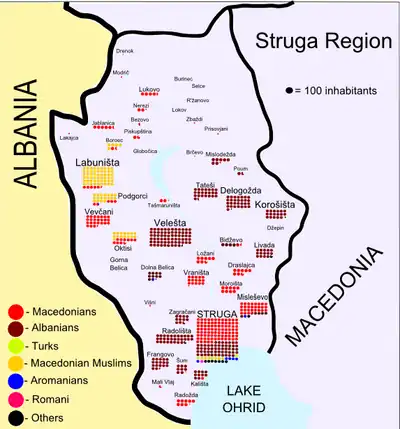 Malesia (Macedonian: Малеcија, romanized: Malesija, Albanian: Malësia; also Struga Malesia, Macedonian: Струшка Малесија, romanized: Struška Malesija, Albanian: Malësia e Strugës) is a small region in Upper Struga Municipality, in western North Macedonia, at the Golema River. It is inhabited by Orthodox Christians, as opposed to the settlements to the south, which are Muslim. Burinec and Selce used to be part of the Debar župa. The Karaorman Mountain is situated to the east of Ržanovo. The toponym Malesija is of Albanian origin from the word Malësi meaning a mountainous area or region.[1] During the period between 1960-1975, many inhabitants of Malesia migrated to Struga. In a 1903 document by the Cartographic Society of Sofia, the villages of Malesia were all registered with Albanian Orthodox majorities, but nowadays they identify as Macedonians.[2]