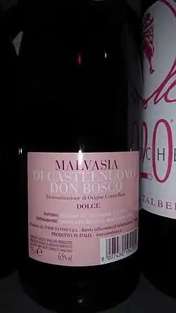 Malvasia di Castelnuovo Don Bosco is a sweet, sparkling, red or rosé DOC dessert wine produced in the Italian province of Asti from the Malvasia di Schierano grape variety with the optional addition of up to 15% Freisa.